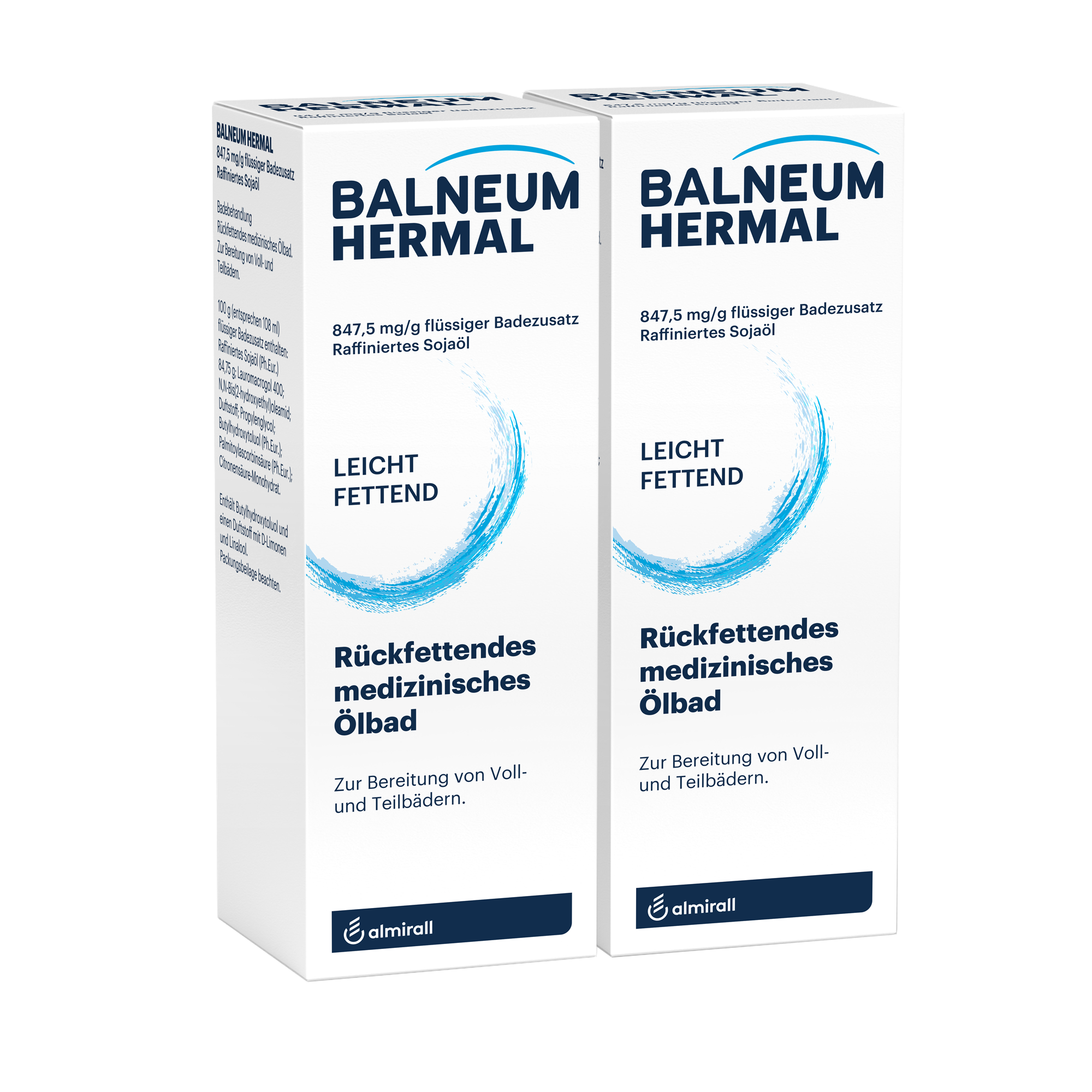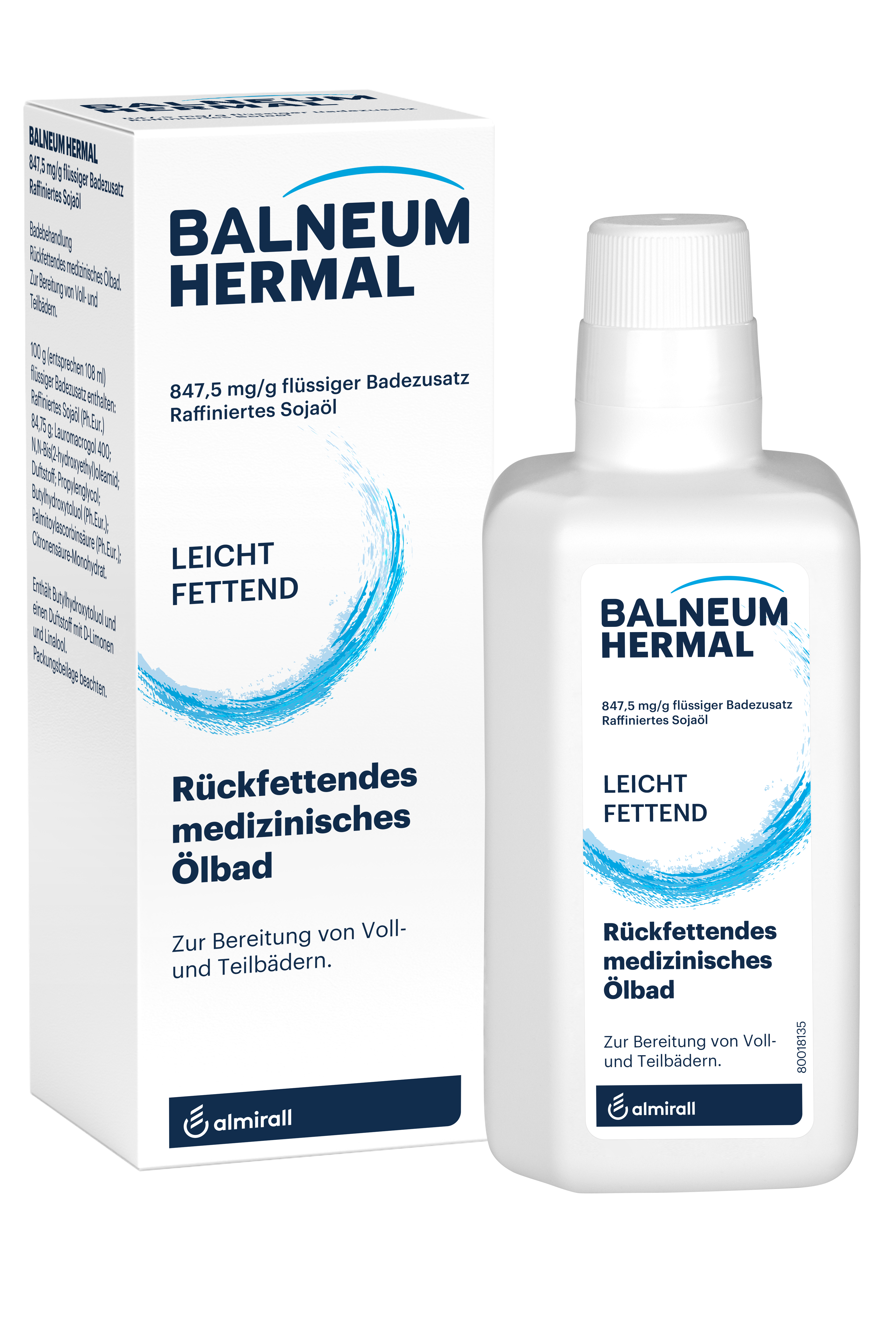 Wirkstoff: Raffiniertes Sojaöl (Ph.Eur.). Zusammensetzung: 100 g (entsprechen 108 ml) flüssiger Badezusatz enthalten: raffiniertes Sojaöl (Ph.Eur.) 84,75 g. Sonstige Bestandteile: Lauromacrogol 400; N,N-Bis(2-hydroxyethyl)oleamid; Duftstoff (enthält D-Limonen, Linalool); Propylenglycol; 0,01 g/100 g Butylhydroxytoluol (Ph. Eur.); Palmitoylascorbinsäure (Ph. Eur.); Citronensäure-Monohydrat. Anwendungsgebiete: Zur unterstützenden Anwendung bei Hautkrankheiten mit trockener und leicht juckender Haut wie z. B. atopisches Ekzem (Neurodermitis), Psoriasis, Ichthyosis, Pruritus senilis, Ekzeme wie Windelekzem, Waschekzem. Gegenanzeigen: Bekannte Überempfindlichkeit gegen raffiniertes Sojaöl, Soja, Erdnuss, D-Limonen, Linalool oder einen der sonstigen Bestandteile; frische pustulöse Formen der Psoriasis; Anwendung von Vollbädern nur nach Rücksprache mit dem Arzt bei: größeren Hautverletzungen; akuten, unklaren Hauterkrankungen; schweren fieberhaften und infektiösen Krankheiten; Herzmuskelschwäche; Bluthochdruck. Warnhinweise: Enthält Butylhydroxytoluol und einen Duftstoff mit D-Limonen und Linalool. Nicht mit den Augen in Berührung bringen! Erhöhte Rutschgefahr in Wannen und Duschen. Nebenwirkungen: Sehr selten: allergische Reaktionen. Nicht bekannt: Erythem, Pruritus, brennendes Gefühl auf der Haut, Hautausschlag. Stand: April 2021