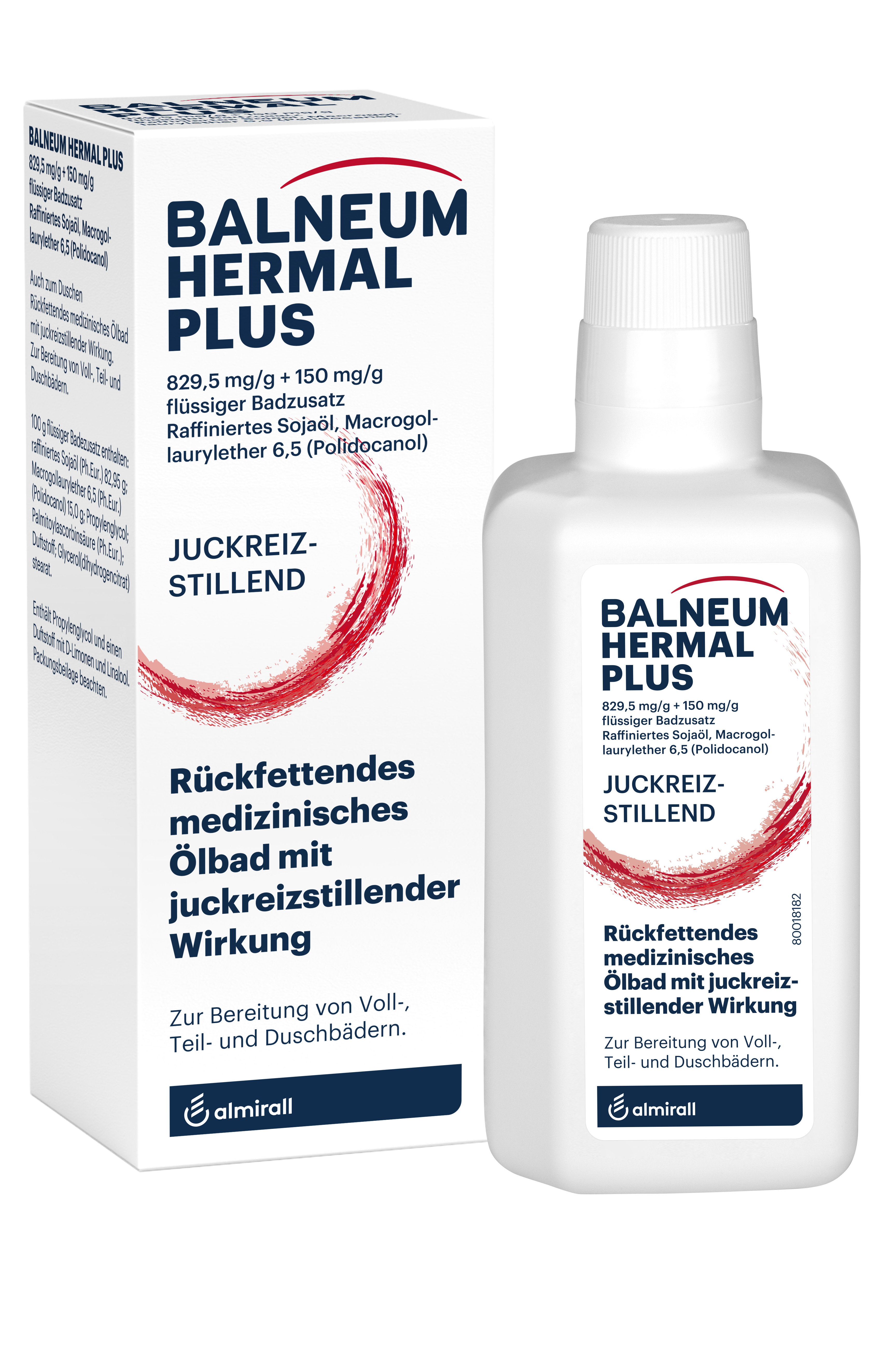 Zusammensetzung: 100 g flüssiger Badezusatz enthalten: Wirkstoffe: Raffiniertes Sojaöl (Ph. Eur.) 82,95 g; Macrogollaurylether 6,5 (Polidocanol) (Ph. Eur.) 15,0 g. Sonstige Bestandteile: 8,5 mg/g Propylenglycol; Palmitoylascorbinsäure (Ph. Eur.); Duftstoff (enthält D-Limonen, Linalool); Glycerol(dihydrogencitrat)stearat. Anwendungsgebiete: Zur unterstützenden Behandlung aller Hauterkrankungen, die mit Austrocknung einhergehen, insbesondere wenn diese von Juckreiz begleitet sind wie z. B. atopisches Ekzem (Neurodermitis), chronisches Ekzem, Pruritus senilis. Zur unterstützenden Behandlung der Psoriasis. Gegenanzeigen: Überempfindlichkeit gegen raffiniertes Sojaöl, Soja, Erdnuss, D-Limonen, Linalool oder einen der sonstigen Bestandteile; frische, pustulöse Formen der Psoriasis; Anwendung von Vollbädern nur nach Rücksprache mit dem Arzt bei: größeren Hautverletzungen; akuten, unklaren Hauterkrankungen; schweren fieberhaften und infektiösen Krankheiten; Herzinsuffizienz, Hypertonie. Warnhinweise: Enthält Propylenglycol und einen Duftstoff mit D-Limonen und Linalool. Nicht mit den Augen in Berührung bringen! Erhöhte Rutschgefahr in Wannen und Duschen. Nebenwirkungen: Sehr selten: allergische Reaktionen. Nicht bekannt: Erythem, Pruritus, Brennen, Hautauschlag, pustulöser Hautauschlag. D-Limonen und Linalool können allergische Reaktionen hervorrufen. Stand: April 2022.