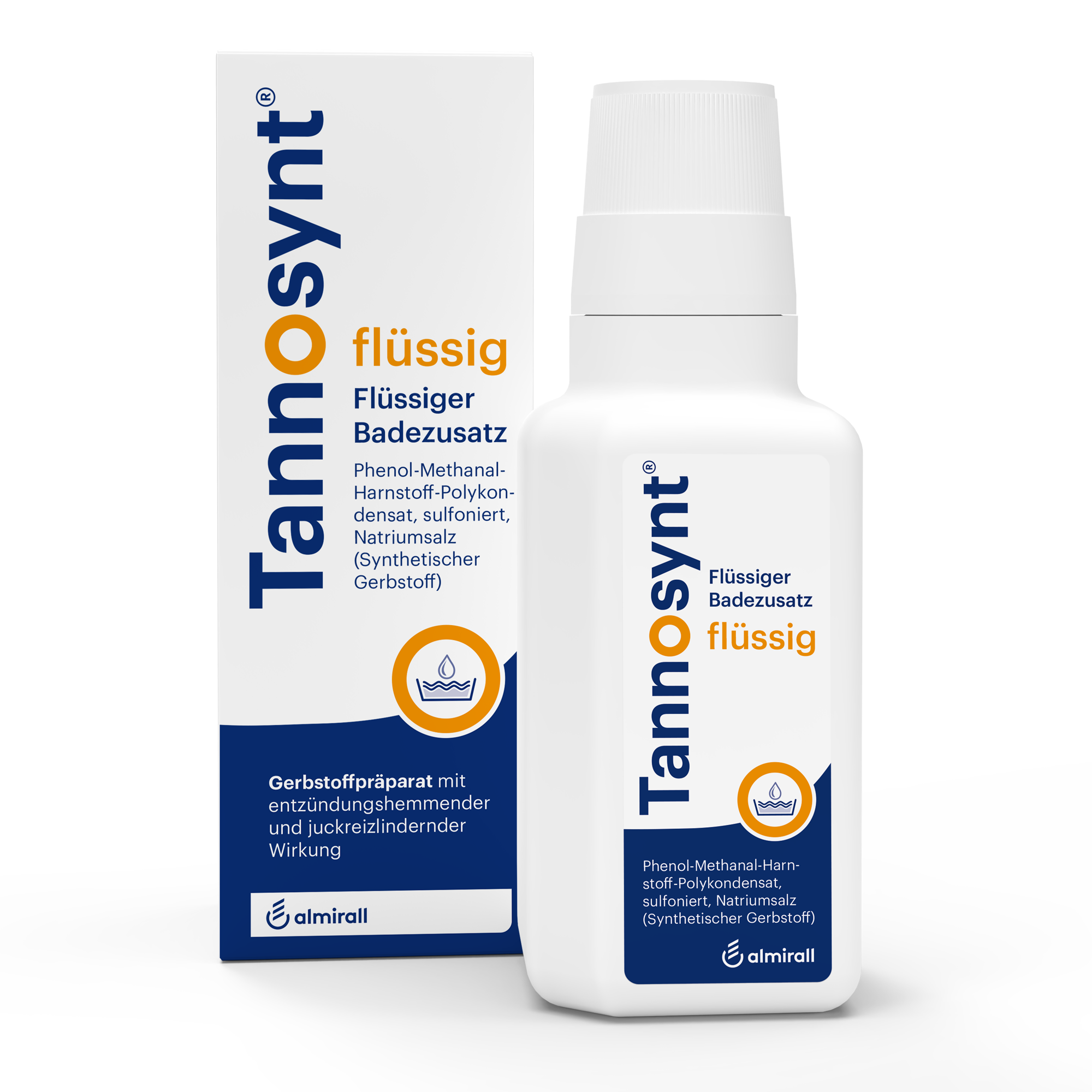 Wirkstoff: Phenol-Methanal-Harnstoff-Polykondensat, sulfoniert, Natriumsalz (synthetischer Gerbstoff). Zusammensetzung: 100 g Tannosynt flüssig enthalten: 40 g Phenol-Methanal-Harnstoff-Polykondensat, sulfoniert, Natriumsalz (synthetischer Gerbstoff). Sonstige Bestandteile: Dodecylpoly(oxyethylen)-2-hydrogensulfat, Natriumsalz; Natriumsulfat gereinigtes Wasser. Anwendungsgebiete: Synthetischer Gerbstoff beeinflusst aufgrund seiner adstringierenden, gerbenden und schorfbildenden Wirkung bestimmte entzündliche, nässende und juckende Dermatosen. Symptomatisch bei akuten, entzündlichen, nässenden und juckenden Dermatosen an schwer zugänglichen Hautpartien, z. B. in den Körperfalten und im Anal- und Genitalbereich; adjuvant bei Windeldermatitis und Hyperhidrosis. Gegenanzeigen: Allergie gegen einen der Inhaltsstoffe. Nicht am Auge anwenden. Vollbäder (auch mit Tannosynt flüssig-Zusatz) grundsätzlich nicht bei schweren Herz-Kreislaufstörungen, Hypertonie, fieberhaften Erkrankungen sowie bei Tuberkulose anwenden. Bei größeren Hautverletzungen und bei akuten unklaren Dermatosen nur nach ärztlicher Rücksprache anwenden. Warnhinweise: Nicht unverdünnt anwenden. Tannosynt flüssig darf nicht in die Augen gelangen. Nebenwirkungen: Sehr selten: leichte Hautreizungen (Brennen, Rötung und Juckreiz). Nicht bekannt: Kontaktdermatitis. Stand: Mai 2025