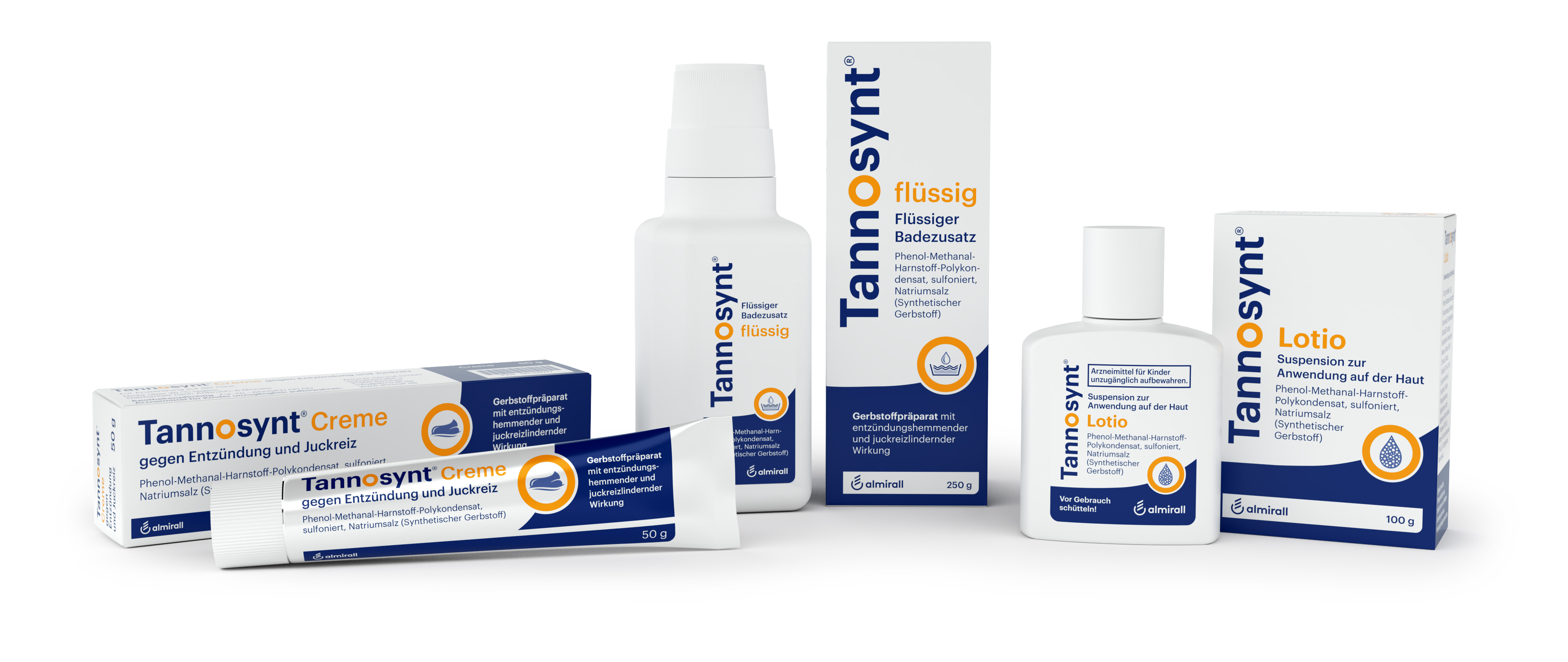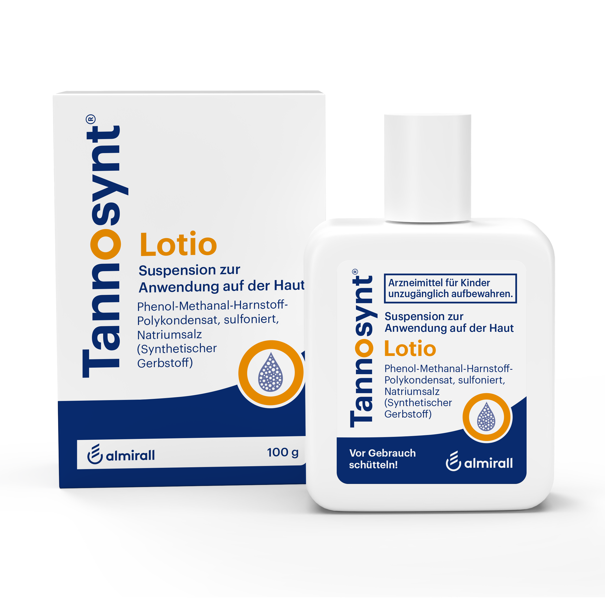 Wirkstoff: Phenol-Methanal-Harnstoff-Polykondensat, sulfoniert, Natriumsalz (synthetischer Gerbstoff). Zusammensetzung: 100 g Lotio enthalten: 1 g Phenol-Methanal-Harnstoff-Polykondensat, sulfoniert, Natriumsalz (synthetischer Gerbstoff). Sonstige Bestandteile: Gereinigtes Wasser; Glycerol 85%; Zinkoxid; Talkum; Tris[alkyl{C<16>-C<18>}poly(oxyethylen)-4]phosphat; entölte Phospholipide aus Sojabohnen; hochdisp. Siliciumdioxid; 2-Propanol (Ph. Eur); Methyl-4-hydroxybenzoat (Ph. Eur); Carrageenan, Natriumsalz. Anwendungsgebiete: Akut entzündliche, nässende und juckende oberflächliche Dermatosen, insbes. in Hautfalten. Windeldermatitis beim Säugling und Kleinkind. Lokaltherapie juckender Hautausschläge, z. B. Windpocken. Hyperhidrosis. Gegenanzeigen: Allergie gegen synthetischen Gerbstoff, Soja, Erdnuss oder einen der sonstigen Bestandteile. Nicht am Auge anwenden. Warnhinweise: Tannosynt Lotio darf nicht in die Augen gelangen. Enthält Methyl-4-hydroxybenzoat und entölte Phospholipide aus Sojabohnen. Methyl-4-hydroxybenzoat kann Überempfindlichkeitsreaktionen, auch Spätreaktionen, hervorrufen. Tannosynt Lotio nicht auf die behaarte Kopfhaut auftragen (an nässenden Hautstellen Haar-Verklebungen möglich). Nebenwirkungen: Gelegentlich: Überempfindlichkeitsreaktionen (Kontaktdermatitis) und leichte Hautreizungen (Brennen, Rötung und Juckreiz). Sehr selten Überempfindlichkeitsreaktionen gegen den Wirkstoff. Entölte Phospholipide aus Sojabohnen können allergische Reaktionen hervorrufen. Stand: Januar 2025